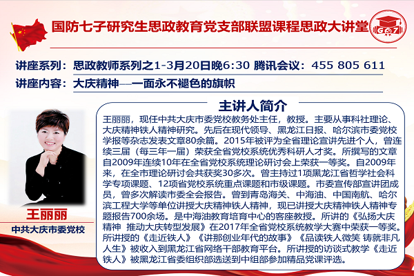 3月20日晚6时30分,为深入贯彻习近平总书记关于党史学习教育的重要讲话精神,将党史教育融入思政课堂,G7研思政联盟举办“国防七子研究生思政教育党支部联盟课程思政大讲堂”,中共大庆市委党校教务处主任王丽丽教授应邀做主题为“大庆精神——一面永不褪色的旗帜”的专题讲座。联盟理事长程建华教授、联盟委员会主任李洪波书记、联盟秘书长贾春以及各联盟成员师生共近100人,通过线上会议认真听取王丽丽教授讲述大庆精神。