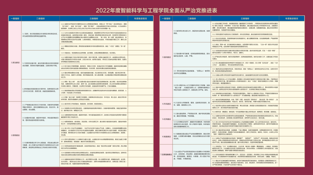 《2022年度xc体育全面从严治党推进表》围绕新时期党的建设的7个方面以指标体系的方式确定了15项核心工作,40项具体任务,形成本年度党建工作的“7-15-40”工程,突出强调党委领导和运行机制到位、思想引领与意识形态阵地坚守到位、基层组织制度执行和组织保障到位、党风政风建设宣传到位、党员教育管理监督到位、重大科研教学工作保障体制到位。