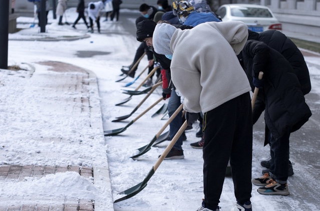 负责人进行扫雪前的动员大会并指明本次活动的目标与意义。负责人分配任务,志愿者们以小组为单位根据负责人的指导领取工具并进行打扫。志愿者们分工明确,互相帮助,经过两个小时的努力清扫将61号楼附近区域及两侧道路上的积雪和冰清扫干净,为经过道路的教师与员工创造一个安全的出行环境。最后,志愿者们检查清扫效果并合影留念。