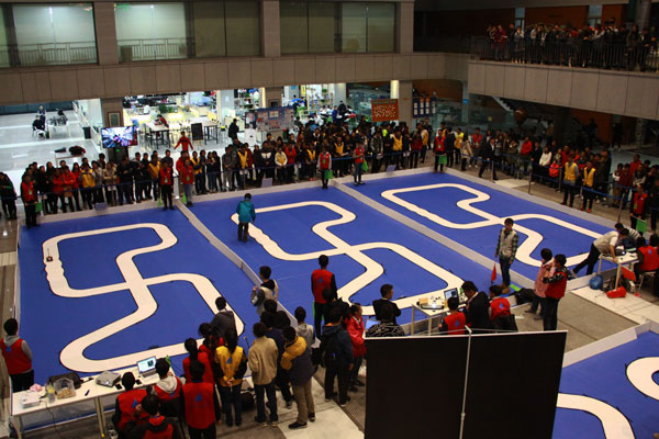 根据不同参赛组别对场地条件的不同要求,赛事主办方规划了三条赛道,各组别的比赛都在既定赛道上有条不紊地进行,既缩短了比赛时间,又增强了比赛的激烈程度和可观赏性。为保持赛道的光滑从而取得更快的成绩,参赛选手都着塑料鞋套进入场地,并且不断用毛巾擦拭赛道,不放过任何影响比赛的因素。赛场边,待参赛的选手也争分夺秒地进行着最后的调试,丝毫不敢松懈。经过两个小时的激烈角逐,大赛决出了电磁组、摄像头组及光电组的冠军。