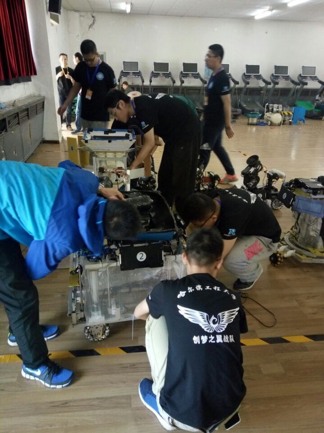 备赛期间,同学们克服重重困难,将部分物资自己从哈尔滨一路搬运至赛场,没有经过任何休息便投入到了机器人调试中,经常写程序调车至天明仅休息两三个小时,在这样疲惫的状态下,同学们没有任何松懈抱怨,而是打起百分之二百的精神来打每一场比赛。