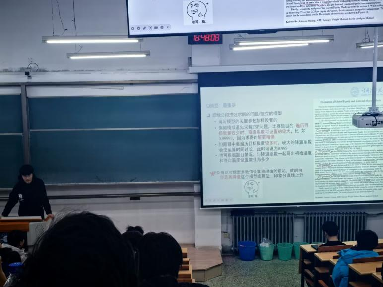 图1 活动全景图 (一)讲课 本期竞赛公益讲座请到了2021级自动化专业的蒋运卓,曾获2023年全国老员工数学建模竞赛国家二等奖、2024年美国老员工数学竞赛H奖、第14、15、16届全国老员工数学竞赛一等奖,对于竞赛知识掌握透彻。