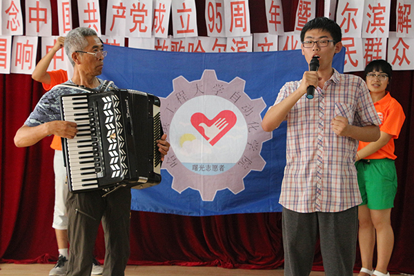 活动开始,永平社区朱丹主任就建党九十五周年及哈尔滨解放七十周年发表主题演讲。随后红平社区老党员同志为观众带来诗朗诵、手风琴和歌唱表演,歌颂中国共产党。志愿者们也为观众带来小品、三句半以及合唱等文艺节目。队员们积极与社区居民互动,一同交流建党以来祖国发生的巨大改变,以及解放以来哈尔滨所发生的巨大改变。最后,文艺汇演在冰上基地儿童的舞蹈中结束。