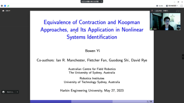 悉尼科技大学博士后衣博文带来了题目为《Equivalenceof Contraction and Koopman Approaches, and Its Application in Nonlinear Systems Identification》的学术报告,主要提出了一种新的数据驱动的方法来学习非线性系统的稳定模型,并使用Koopman嵌入将原始状态空间提升到更高维的线性流形,同时通过稳定线性系统的直接参数化来加强模型的稳定性,从而大大简化了所涉及的计算。