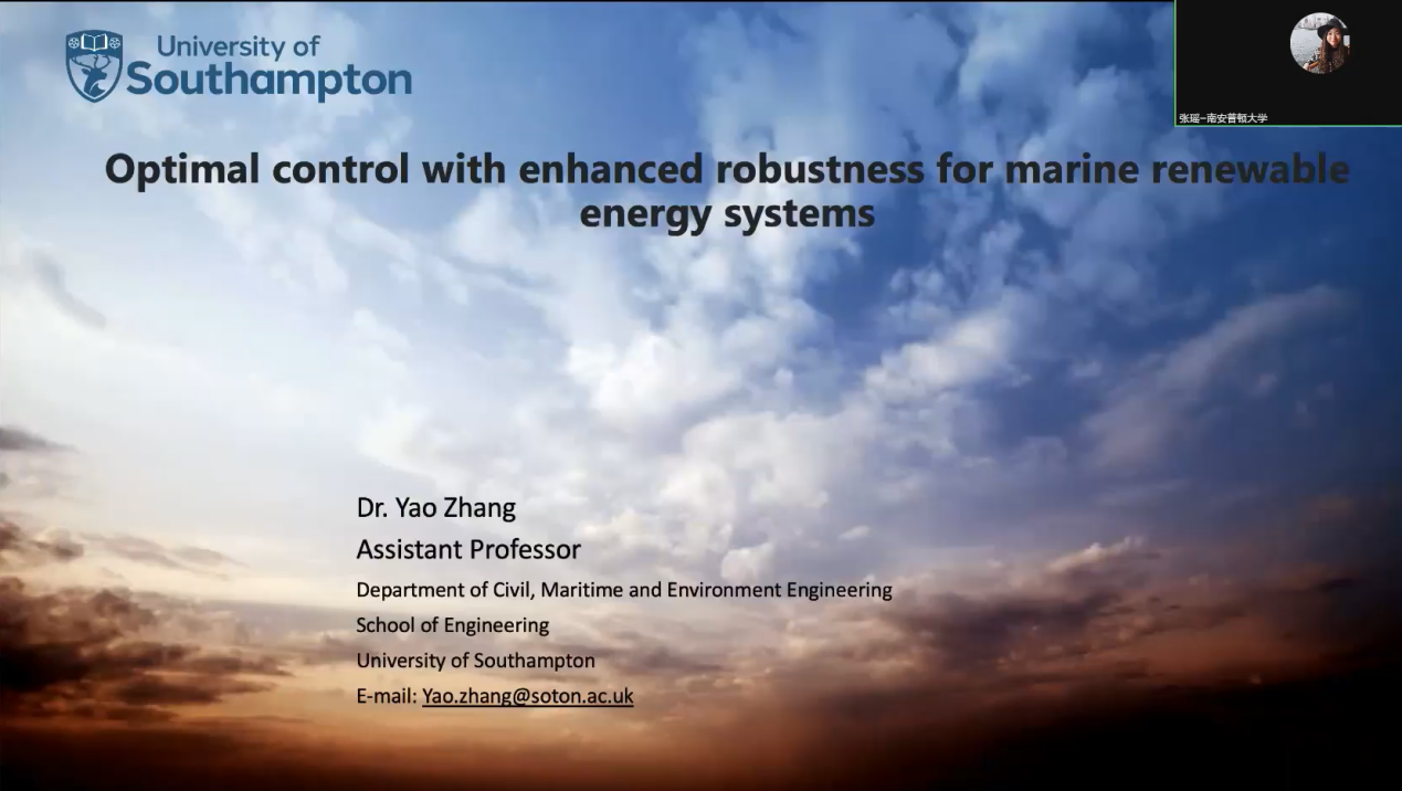 英国南安普顿大学助理教授张瑶带来了题目为《Optimal control with enhanced robustness for marine renewable energy systems》的学术报告,报告主要研究有效缓解预测误差导致的控制性能下降的方法,并通过先进的鲁棒在线估计器取代高成本传感器来降低成本。所提出的控制方案不会造成沉重的计算负载,从而能够在标准计算硬件上实时实现,对于具有复杂动力学的海洋系统的控制尤其关键。