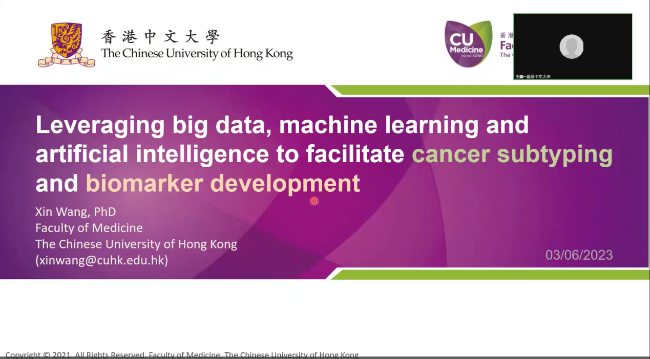 香港中文大学副教授王鑫带来了题目为《基于组学大数据、机器学习和人工智能的癌症分型和肿瘤标志物的研发》的学术报告,报告主要介绍精准医学时代的人工智能和大数据,突出多种来源、多组学数据整合分析的优势。利用关于癌症分型的研究,来举例说明各种综合分析策略的优势,并通过案例介绍如何利用数据集成分析,结合机器学习和人工智能方法,来研发用于癌症诊断和早期检测的生物标志物。