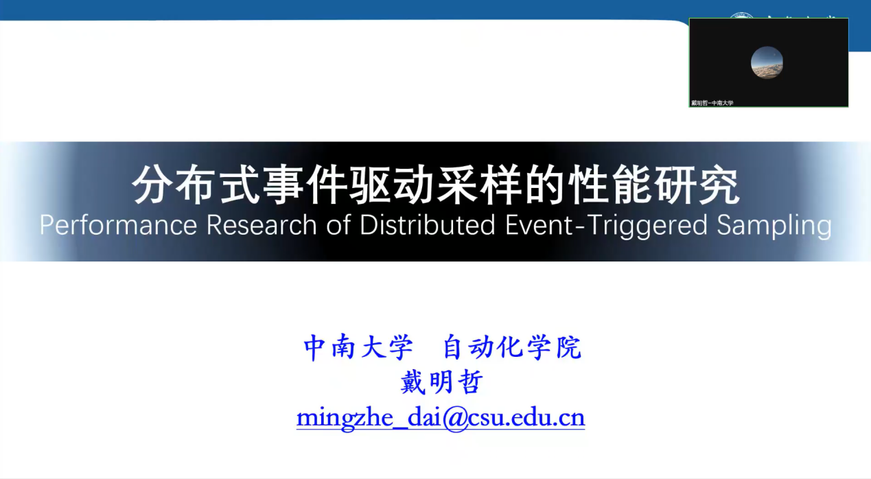 中南大学讲师戴明哲带来了题目为《分布式事件驱动采样的性能研究》的学术报告,报告针对分布式多智能体系统协同事件驱动采样控制方法进行研究,从控制系统的性能层面综合考虑传感器采样率、计算机算法复杂度、通信网络数据传输率、执行器更新率和智能体状态收敛特性等,探讨分布式事件驱动采样系统的性能设计、分析与评价的方法,并进一步探讨其在航天器姿态跟踪、航天器集群姿态协同编队控制的工程场景中的应用。