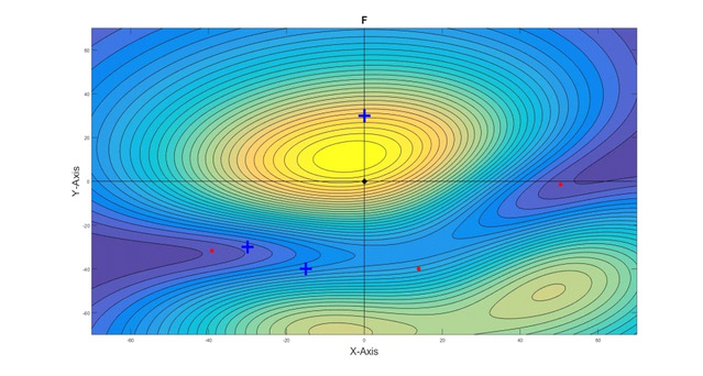 The efficacy of the proposed method was analyzed using simulation examples. One of the example in which one target AUV will be cooperative localized with RSS measurements from three sensors is shown in the fig. below. The figure indicates the initial (blue cross) and optimal positions (red dots) of the sensors and the value of evaluation function in 2D contour plot.