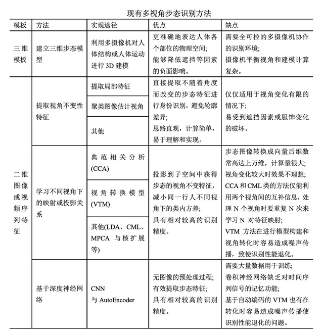 早期的多视角步态识别方法主要是提取视角不变的步态特征。随着三维建模与多摄像机协作技术的发展,建立3D步态模型也很好的解决了识别中的视角问题; 同时基于度量学习的方法也被用于多视角的步态识别中,通过投影到子空间获取视角不变特征,取得了相对较高的识别精度。而深度学习利用深层神经网络学习出高层抽象的步态特征,在步态识别的视角变化中也取得了良好的识别效果。下表比较了现有的多视角步态识别算法。