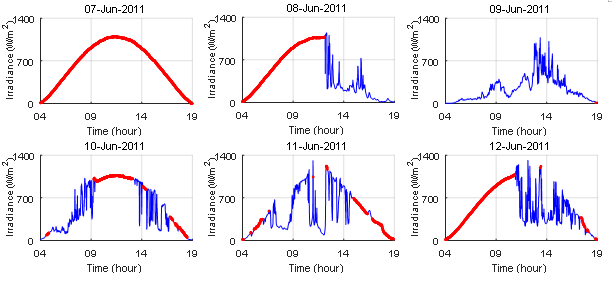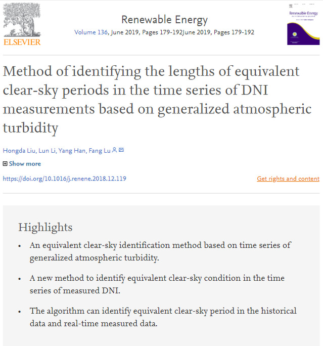 近日,刘宏达副教授团队在国际期刊Renewable Energy(JCR一区,IF=5.439)上发表新文章(DOI: 10.1016/j.renene.2018.12.119)提出了一种使用基于广义大气浊度,直接利用辐照度(DNI)的时间测量序列来识别等效晴空周期长度和分布的方法。通过实地数据的进行了验证,并与其他方法进行了比较。该方法降低了对测量设备的要求,并从新的角度为此类工作提供了新思路。