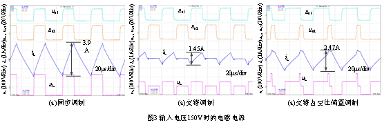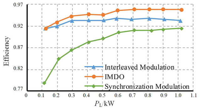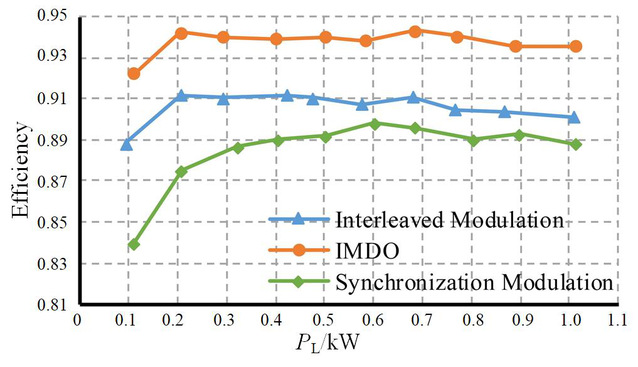该方法兼有交错调制和组合控制方式的优点。相对SM,IMDO具有显著降低的电感电流纹波;相对IM,IMDO具有更低的电感电流平均值;并且与SM和IM相比较,由于IMDO方式下其具有更高的功率直接传输比,因而有助于获得更高的变换效率。而相对组合控制方式,在IMDO下,可获得统一的小信号控制模型用于控制系统的设计,有效避免在不同工作条件下的控制模式切换问题。