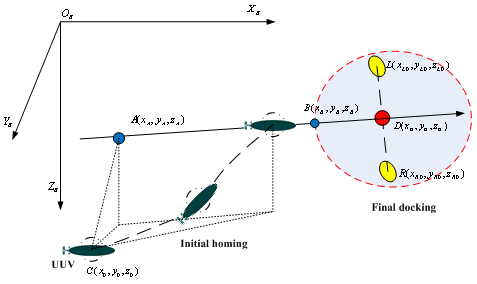 的连线;2)在最终回坞阶段,UUV一般以低速状态抵近最终回坞点,其动力学方程通常假设是全驱动的,其控制方案类似于动力定位。