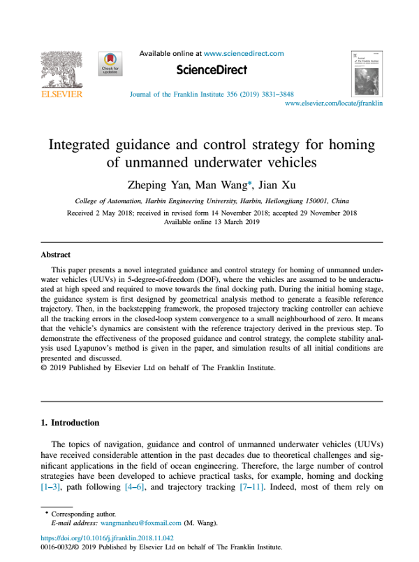 近日,严浙平教授团队在国际期刊Journal of the Franklin Institute(JCR一区,IF=3.653)上发表新文章(DOI:10.1016/j.jfranklin.2018.11.042),提出一种新颖的欠驱动UUV自主归航任务下综合制导与控制策略,使得欠驱动UUV能够在制导系统作用下,按照指定回坞参考轨迹,自主返回并抵近最终回坞点。