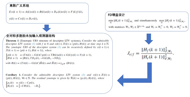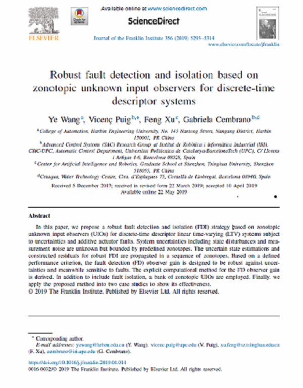近日,407教研室王烨副教授在国际权威期刊Journal of the Franklin Institute(JCR Q1区,中科院Top期刊,IF=3.653)发表新文章(Volume 356, Issue 10, July 2019, Pages 5293-5314),提出了一种对于广义系统的鲁棒故障检测与隔离方法,该方法利用全对称多胞胎未知输入观测器来保证鲁棒性,为故障检测与隔离提供了一种新途径。
