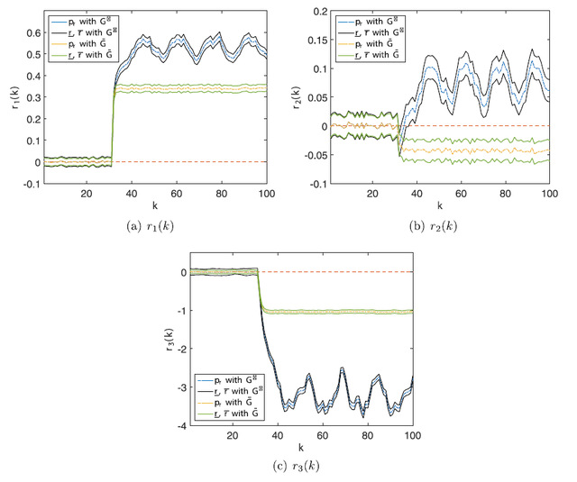 在验证故障检测仿真结果中,通过对比卡尔曼滤波增益(绿色线)与最优故障检测增益(黑色线),发现黑色线更偏离坐标原点,即表明文章中所设计的最优故障检测增益使全对称未知输入观测器对于故障更灵敏。