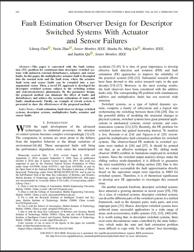 近日,赵玉新教授团队在国际权威期刊IEEE Transactions on Circuits and Systems I: Regular Papers(JCR Q2区,IF=2.823)发表新文章(66(2), 810-819, 2019),提出了一种针对切换广义系统的执行器与传感器故障同时估计方法,并将该方法应用到一类切换电路系统。据悉,该方法首次在统一的框架内同时考虑切换广义系统的执行器与传感器故障估计问题,为复杂切换系统的故障诊断、容错设计提供了新思路。