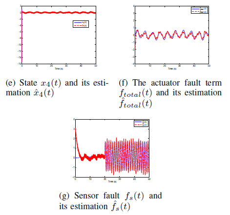 该方法主要包含两部分:即系统的增广与观测器设计。系统增广过程是构造一个新的增广向量同时包含需要估计的系统状态、执行器与传感器故障,并给出该增广系统的观测器存在条件。在此基础上,利用矩阵参数设计方法设计了降维的故障估计观测器,实现了误差方程对于干扰的解耦,并解决由于坐标变换引起的切换点处系统状态的跳变问题。最后,利用观测器提供的系统状态、执行器与传感器故障的估计信息,为后续的分析及容错控制提供技术支撑。
