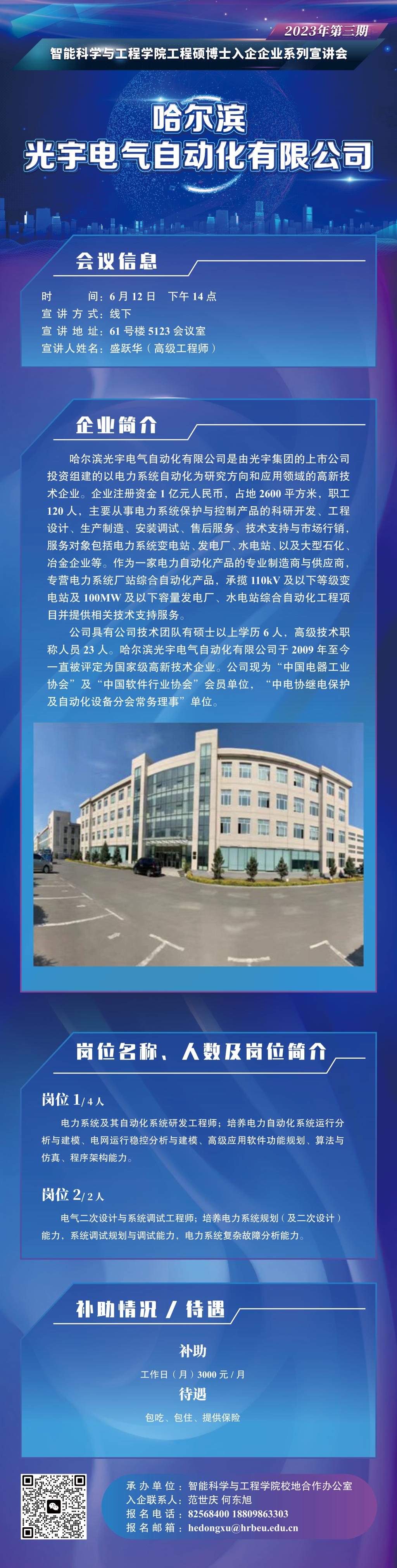 xc体育工程硕博士入企企业系列宣讲会第三期——哈尔滨光宇电气自动化有限公司