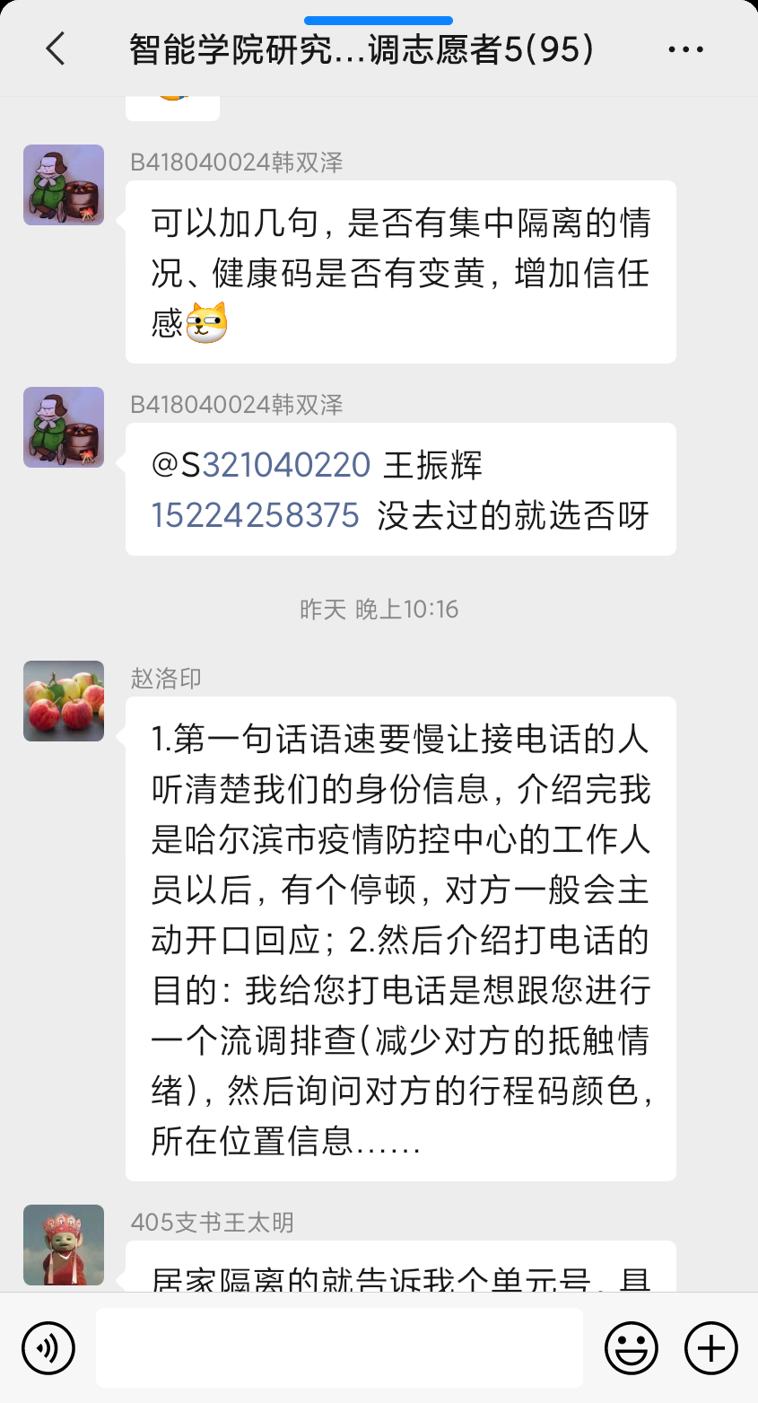 针对近期疫情严峻复杂形势,哈市居民涉及轨迹重合、时空伴随等情况复杂,为精准做好疫情防控工作,公司需大量志愿者开展信息流调工作,公司发挥党支部战斗堡垒和党员先锋模范作用,齐心协力做好疫情防控,第一时间积极相应,协助公司、新建派出所完成流调工作,吸纳各年级优秀党员、员工骨干。员工积极响应,自发加入志愿服务队伍,一小时内已有近100名员工报名参加,助力疫情精准防控,用自己的实际行动诠释着“疫情当前,责无旁贷”的使命担当。