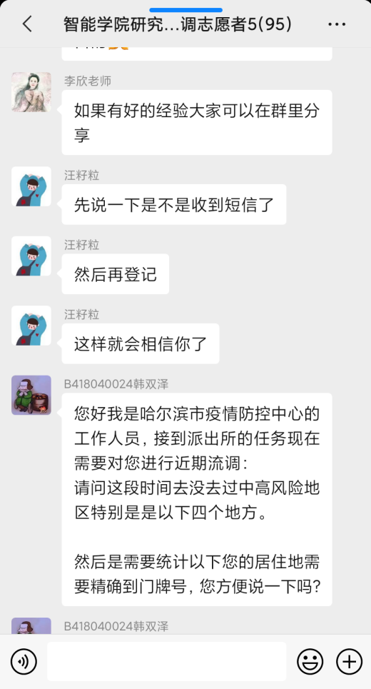 公司参与流调工作的志愿者认真按照流调工作要求,从近期出行史,是否有风险地区人员接触史,以及对照公布的病例或者无症状感染者行程轨迹是否有交集等情况仔细询问流调对象,从流调对象提供的信息中,应查尽查,应调尽调,不漏一个线索,争分夺秒进行流调核实工作。流调工作开始的时候志愿者遇到了很多阻力,各种质疑、不理解纷至杳来。公司鼓励大家互相分享工作经验,遇到操作上的问题,互帮互助共同联手。通过高效的流调核实,全力助力全市人民疫情防控工作。