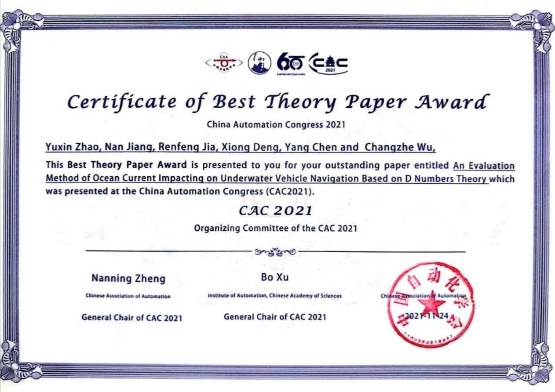 获奖论文在赵玉新教授的指导下,由博士生姜南撰写完成。文章针对潜器在复杂水下环境中航行安全受到威胁的问题,研究了一种考虑海流影响下的潜器航行安全评估方法,为水下安全航行提供辅助决策支持。